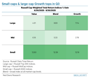 Despite these crosscurrents, equity markets climbed a wall of worry, extending their rebound with notable strength. The S&P 500 posted its strongest third-quarter performance since 2020, rising 8.1% and gaining roughly 14.8% year-to-date.[1] Quarterly gains were propelled by AI beneficiaries, positive earnings surprises, and growing expectations for Federal Reserve easing. Technology led the advance, while participation broadened as volatility fell to multi-year lows. As a result, small-cap stocks outperformed, rallying more than 12% during the quarter.[2]